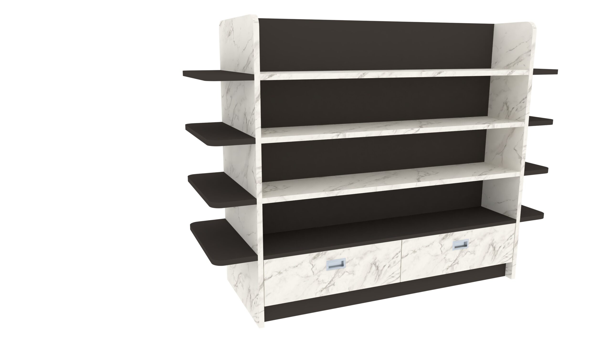 Η διπλή όψη προσφέρει μέγιστη αξιοποίηση χώρου, ενώ ο κάτω αποθηκευτικός χώρος με πόρτες επιτρέπει την αποθήκευση επιπλέον αποθεμάτων ή βοηθητικού υλικού. Η κατασκευή είναι στιβαρή, με στρογγυλεμένες γωνίες για ασφάλεια, και προσφέρεται με δυνατότητα προσαρμογής διαστάσεων, χρωμάτων και υλικώνανάλογα με τις ανάγκες του πελάτη.